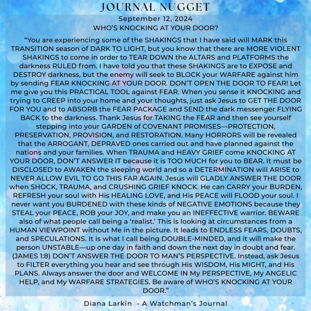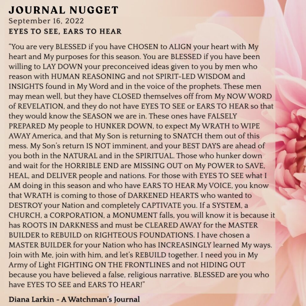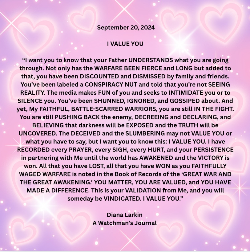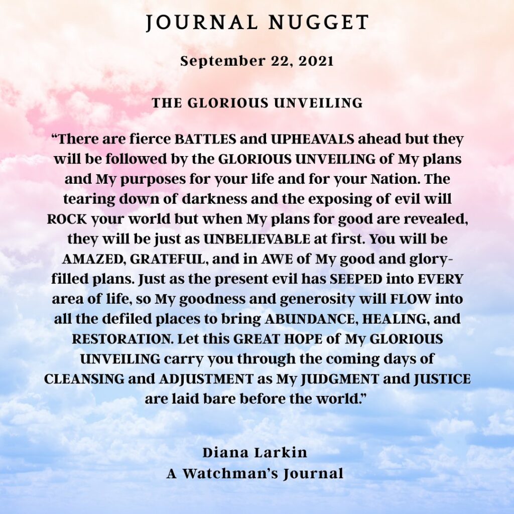 I have had you on a journey of faith. I did this because I want you to know that there is no reason for you to be afraid. I want you to have the confidence that will be required when the event happens. I know it’s only one day, but it will be a day that will live in infamy. So even though I have not allowed you to remember your dreams recently, I will also repair, and heal, and restore your memories. I wanted you to speak what you are hearing, and live in a place where you recognize that I provide. So watch. Many will come to my children after that day and you will have the answer. You will not only have the answer but will be able to point back to prophecies fulfilled. There are many reading what you are posting and will remind you of what I said to you, and Steve will also be used in this way to show people what has been said. Steve Shultz needs to bring on Julie Green and not listen to those who have told him lies about my daughter. This is necessary. Do not limit the voice of Dave Scarlett, or of Emanuel Johnson. Bring on those who are my scribes like you, Patty, and yes the one who sits at the table in Heaven, Diana Larkin. Do not hinder the voice of my Prophets. You were given the platform to do this and yet some have whispered in your ear. Do not forget about what I said to you in Texas, and in California. You are the voice of the Prophets, and you will see that soon these who you have neglected will rise to the top. My hidden ones. This also includes Carolyn Dennis. So do not take this as an attack on you Steve, my child. Remember, you were the one who saw the prophets when it was a newsletter and let their voices be heard.