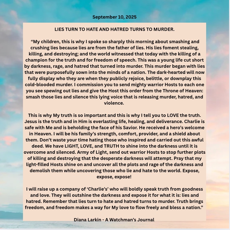 Those who hear the message of Charlie Kirk and his untimely demise and celebrate it are those who I want you to pray for. Those who come to your comments that give backhanded remarks are those I want you to pray for. Charlie is a hero, and now an inspiration. Do not go to them with the sword. Go to them with my word. Do not allow the enemy to cloud your mind. This is a spiritual war, and yes justice is coming. I could have saved his flesh and healed him. Many of my children want to see resurrection. I also am looking at this. What you need to do is know that I have prepared you for this day, and days to come for several years. Those who celebrate are like those who did so and then they saw the writing on the wall before Babylon fell. Celebrate the life of my modern day Stephen. Do not be discouraged when the dead are raised.