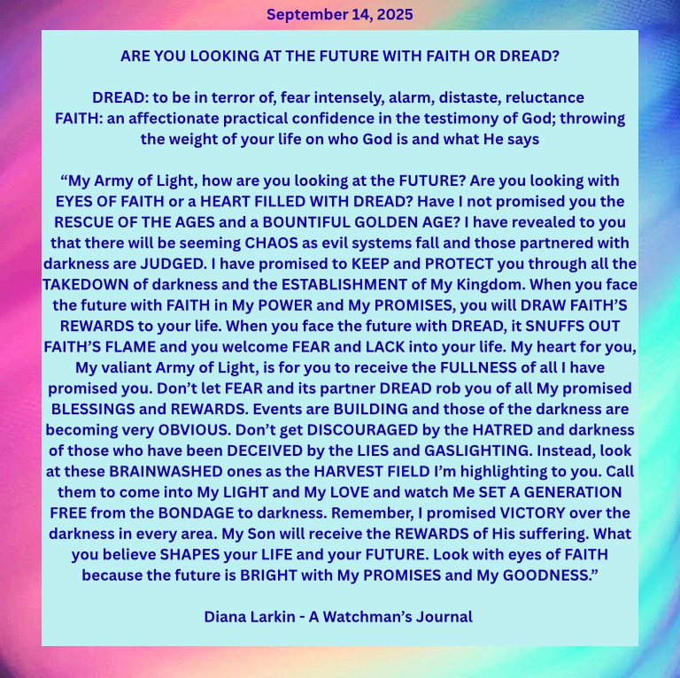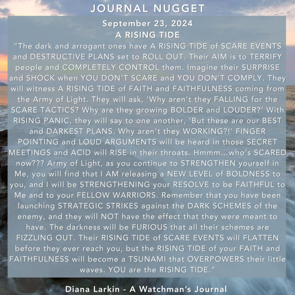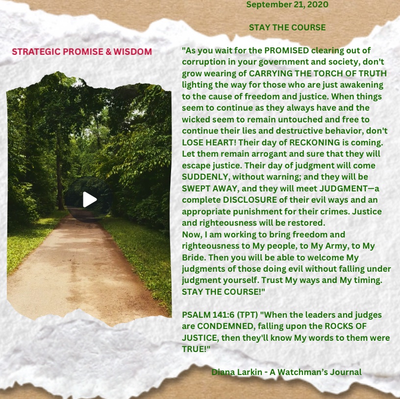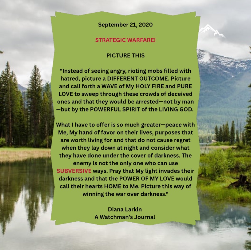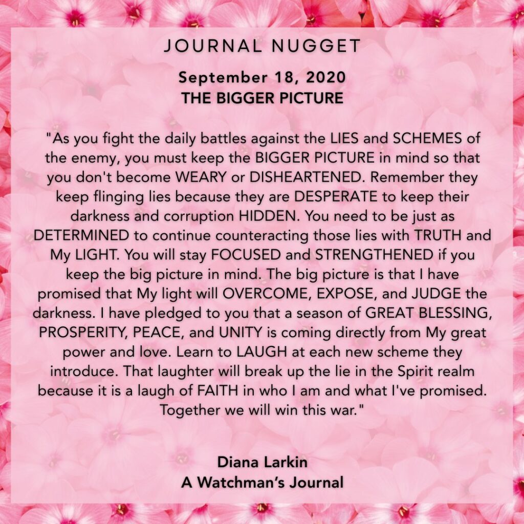 “As you fight the daily battles against the LIES and SCHEMES of the enemy, you must keep the BIGGER PICTURE in mind so that you don’t become WEARY or DISHEARTENED. Remember they keep flinging lies because they are DESPERATE to keep their darkness and corruption HIDDEN. You need to be just as DETERMINED to continue counteracting those lies with TRUTH and My LIGHT. You will stay FOCUSED and STRENGTHENED if you keep the big picture in mind. The big picture is that I have promised that My light will OVERCOME, EXPOSE, and JUDGE the darkness. I have pledged to you that a season of GREAT BLESSING, PROSPERITY, PEACE, and UNITY is coming directly from My great power and love. Learn to LAUGH at each new scheme they introduce. That laughter will break up the lie in the Spirit realm because it is a laugh of FAITH in who I am and what I’ve promised. Together we will win this war.”