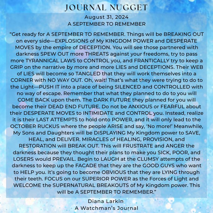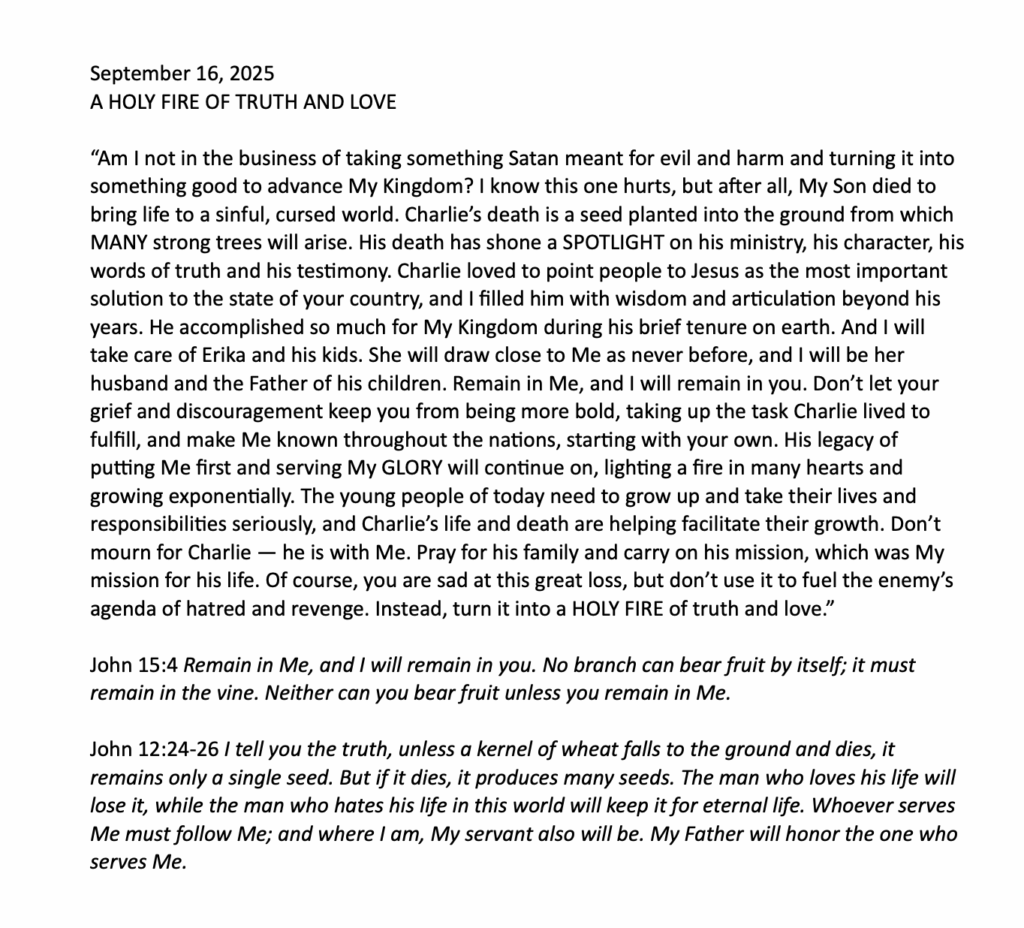 Concerning the youth and turning point USA. What I told you earlier is true. The youth are an army that is rising and it will not be time for them to come home to their heavenly reward. These are they who I will position in places of influence and authority. These will be those who set the course of your Nation and impact the world. What you saw happen to Charlie Kirk is not going to be for the purpose originally intended. The fire it has lit will ensure that my light, my glory, and my name will be preached for generations in your streets. The Kingdom proclaims the name of Jesus/Yeshua, and nothing will stop what I the Lord have planned.