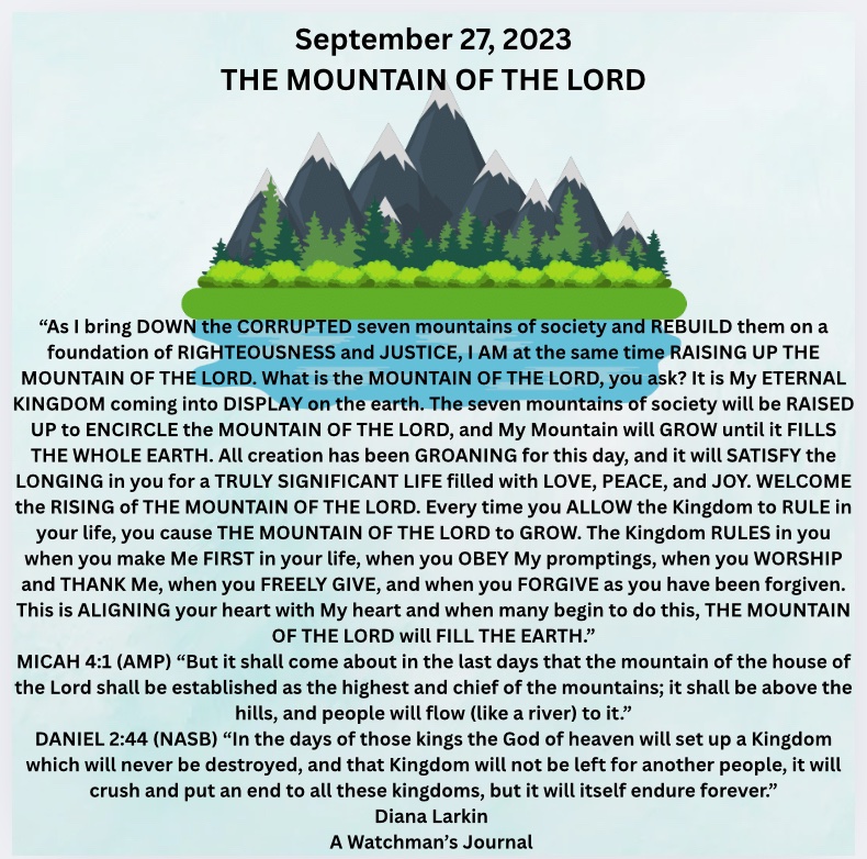 My children, you are about to see the Mountain of religion crumble. Not that it will not be needed, but rather it has become so polluted with man’s ideas, and in some places “doctrines of devils.” I will build my Ecclesia, and also you will see me raise up my Holy Mountain that will no longer operate with a mask of Me but rather truly fulfill the Kingdom Purposes that I have always intended for it to accomplish. Then victorious shouts shall be heard through my NEW Mountain of Religion, and the people will no longer have to wonder if the church will help their needy, feed their orphans, build homes for them, and love the way that I want you to. And yes even the doctrinal questions will fizzle away, the walls of separation between denominations will fall into their own footprint, my people will not look at each other sideways but rather embrace one another, and celebrate victory after victory over the enemy. Then it will be known as the Mountain of GOD, for people will not go there to learn of religion but to come into right relationship with Me.