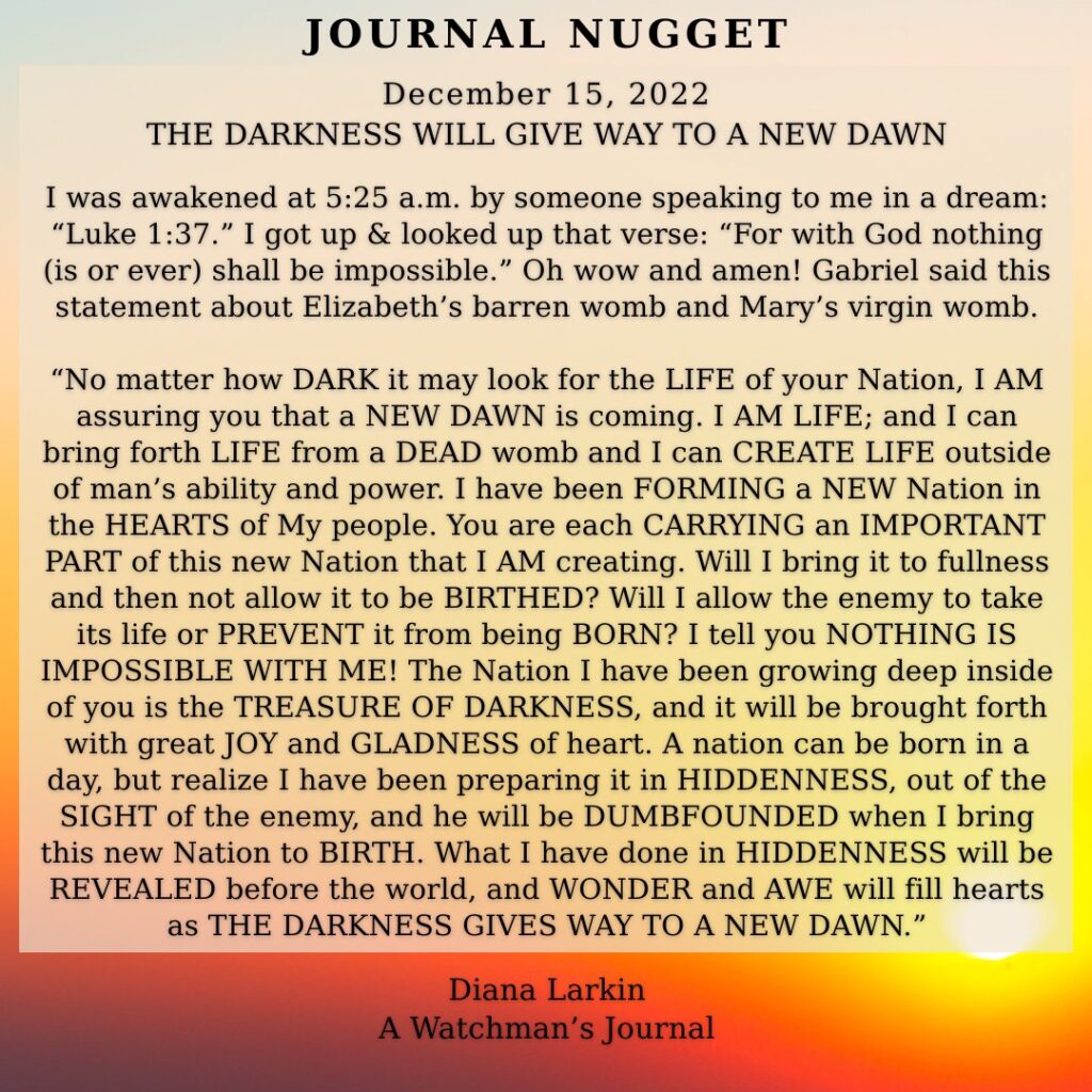 “You, My Army of Light, have an EVEN GREATER and more FULFILLING ASSIGNMENT after the war of DARK TO LIGHT has been won. You are called to arise as Sons and Daughters of My Kingdom and to fulfill the call on your lives to be THE REBUILDERS. The enemy and the evil empire CONSPIRED with GREEDY, ARROGANT people to DESTROY your covenant nation through INFILTRATION of DEFILING IDEOLOGIES, SIN TRAPS, and the DESTRUCTION of MANHOOD and the FAMILY structure. My Church should have been the FORTRESS OF TRUTH raised up against the destructive schemes and lies of the darkness, but they became CAPTIVES to FALSE DOCTRINES that ROBBED them of their POWER and AUTHORITY and of the GOOD FUTURE of Kingdom fulfillment that I had for them on the earth as it is in Heaven. The world was left to go into DARKNESS and DECAY because My Church was meant to be the LIGHT OF THE WORLD and the SALT OF THE EARTH. But now, My Remnant have AWOKEN to My VOICE, My LOVE, My POWER, and the VISION of a GOOD FUTURE that I have for the Church, your nation, and the world. You have learned to DEFEAT the darkness, and I will come to put the darkness UNDER YOUR FEET.”