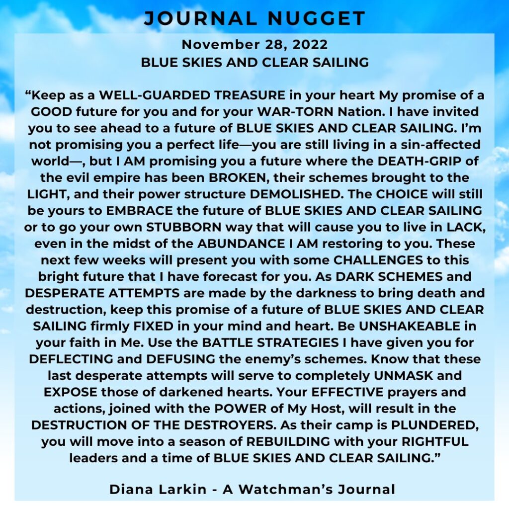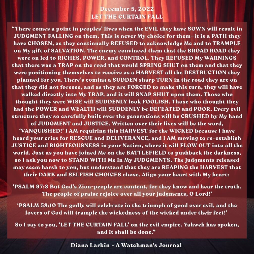“You who wanted to CONTROL the world with TYRANNY and DESTRUCTION, will have NO CONTROL OVER YOUR DESTINY; and you will be required to DRINK THE FULL CUP OF WRATH that you planned for others. The individuals and nations who have chosen to pursue RIGHTEOUSNESS, JUSTICE, and PEACE, your DESTINY will unfold with GREAT BLESSING and REWARD. Your enemies will be FORCED TO WITNESS Me LIFT YOU UP into their leadership positions and to WATCH YOU ENJOY their wealth which will be returned to you.”