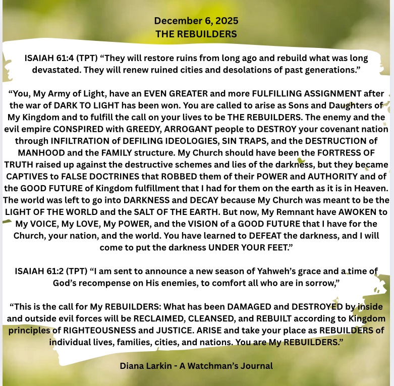 “This is the call for My REBUILDERS: What has been DAMAGED and DESTROYED by inside and outside evil forces will be RECLAIMED, CLEANSED, and REBUILT according to Kingdom principles of RIGHTEOUSNESS and JUSTICE. ARISE and take your place as REBUILDERS of individual lives, families, cities, and nations. You are My REBUILDERS.”