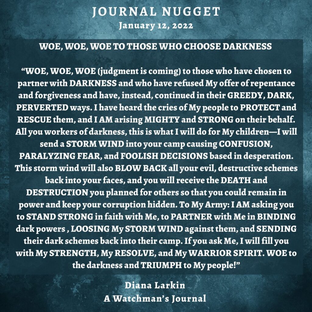 “I want to let you know that the evil empire is building a DARK STORM that they plan to release on your East Coast. They are planning to unleash DEATH, DESTRUCTION, and CHAOS that will TERRORIZE the nation and bring it under their control. The darkness is very FOCUSED on their UGLY schemes, and I have BLINDED them from seeing the MONSTER STORM that I AM building to OVERCOME their plans. I AM coming to DESTROY the DESTROYERS. This MONSTER STORM is empowered by My RIGHT ARM of righteous power, by My BURNING WRATH against the evil and idolatry, by the PRAYERS and WARFARE of My Army of Light, and by My FIERY WARRIOR HOSTS and POWERFUL ANGELS. Nothing and no one can stand before My MONSTER STORM. Pray that My UNDERCOVER Hosts and your UNDERCOVER Military would remove much of the DEATH and DESTRUCTION that is planned by the evil empire from their dark storm. Pray that this would SHAKE your nation AWAKE to the deep darkness trying to CONSUME them but that it would also cause a GREAT AWAKENING to My REALITY, My POWER, My HOLINESS, and My LOVE. Great is My love for you and powerful is My RESCUE OF THE AGES.”