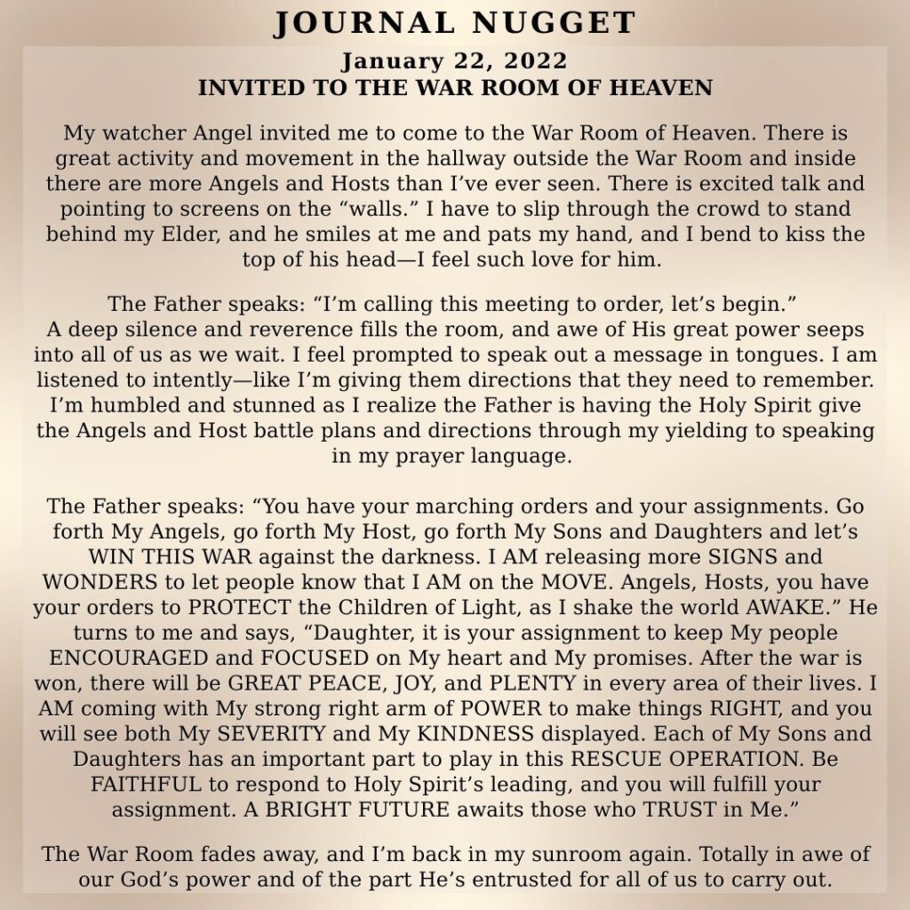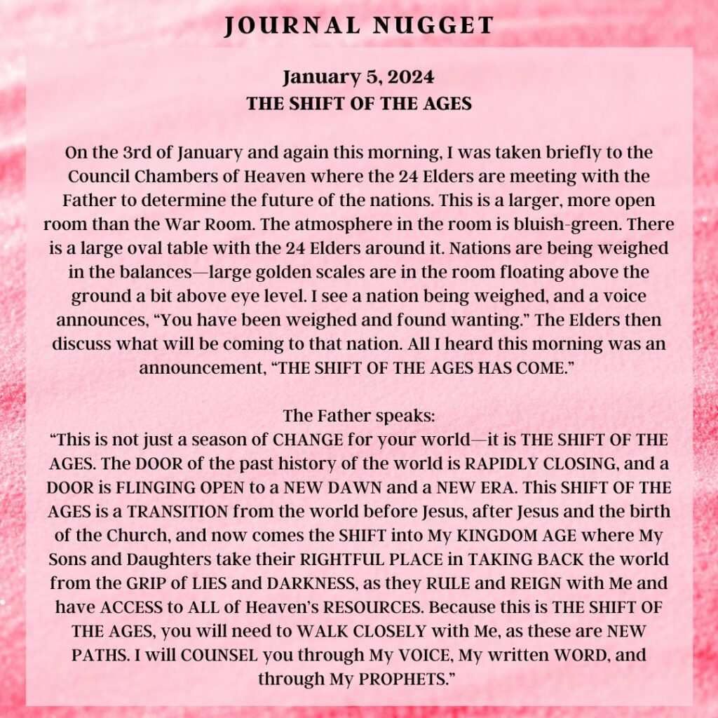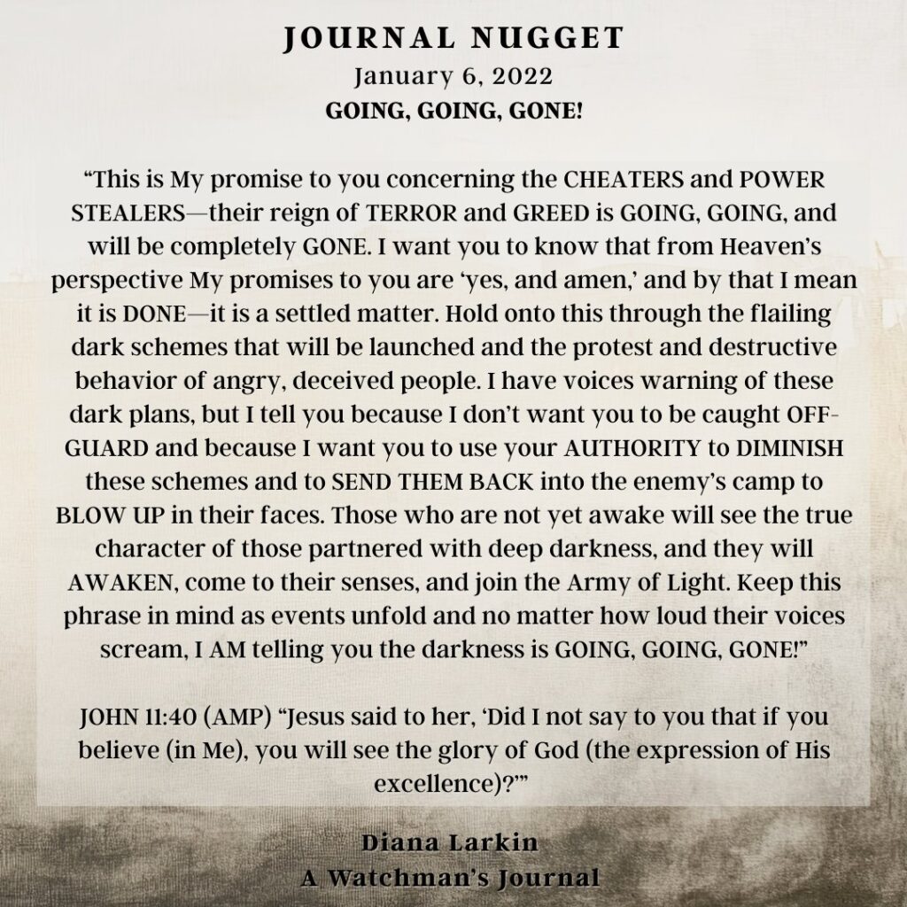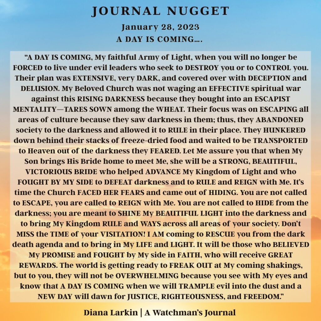 This is the journey of a lifetime, and now you will begin to see how all the hard work will pay off. So do not be afraid of the narrative coming from those speaking doom and gloom. Do not attack them, pray for them. As for you, focus on what I have called you to do. Two things can be true. Time is running out, and my Kingdom will never end. It’s not time is running out as in you only have a few more hours, or days. It is the end of the age of the wicked, and a deliverance of my people, and those who have been brainwashed, and are victims. It is for them to come to the light of the sons and daughters of GOD, for them to be part of the harvest that I have planned. Like you heard Carolyn say people will be needed to disciple, love, and train them. This is true. So watch my hands and how they work this year through my children. The gates of hell shall not prevail!