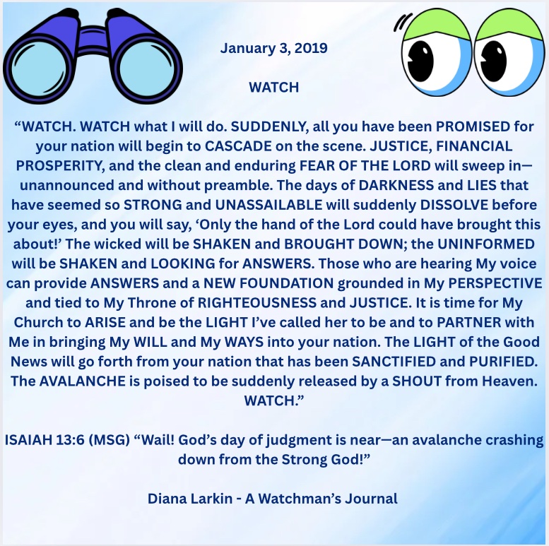 There are things that I am going to do with you this year that are going to blow your mind, not just you but also my children. You see the devil has thought to unload EVERYTHING he has left, but it will not be enough. There are plans that he has that I am aware of and somehow he believes that I am clueless to it. Watch, watcher, how I do these things. Deliverance of your nation, and yes individuals as well. This is the time where I take my hand and with great force turn the ship called America.