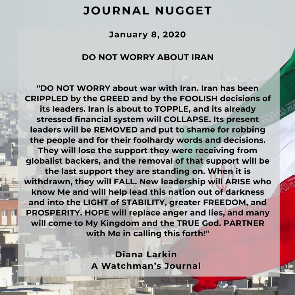 I am intervening in Iran, and not everything you see is actually happening. I will transform this country because of my children who have suffered under satanic rule. There will be clean and swift change. You will hear the words “clean and swift” in regards to the operation that will unfold. It will come like a thief in the night. So they are facing a countdown, the clock is ticking, and they are in a small window of repentance before I strike, and I will use my good Military to do so. The people will be free once again, and Christianity will be called the number one religion in this country. Those who have harmed my children will face my hammer, my swift justice. The tears will fall in one night. Those who are wicked will cry tears of sorrow, and the righteous will cry tears of joy.