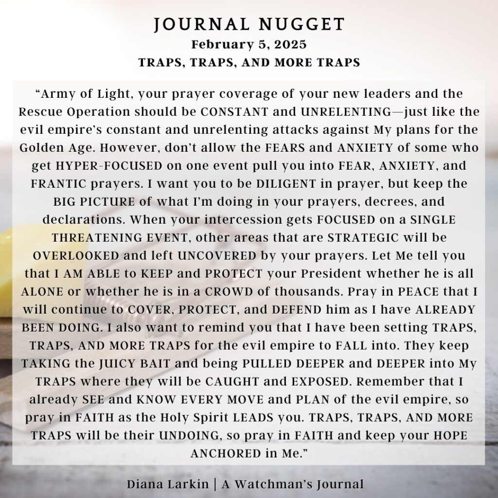 Who is Trump? He is the one that is like a John the Baptist. Yes is he my David, but he is also the one who chose to be a Moses at this time. You can see many parallels if you are looking to Me and you are reading your Bible. He is like John because he is doing the work to prepare the way for judgment, justice, and the Kingdom of GOD that will soon be realized through the children of GOD. The prayer I prayed wasn’t just an example it is the goal. The Father’s Kingdom and Will be done on Earth as it is in Heaven. That is what you are fighting for. That is why this war has intensified. It’s about ownership and territory. The kingdom of darkness knows that it is losing and cannot believe it to be possible. So stand and shine forth my light to the nations. You will see me intervene as you continue to partner with me. This isn’t about Trump, though I am using him. This is about what I have foretold from the beginning. My children will crush satan under our feet together! That is what you should focus on and what you need to look forward to.